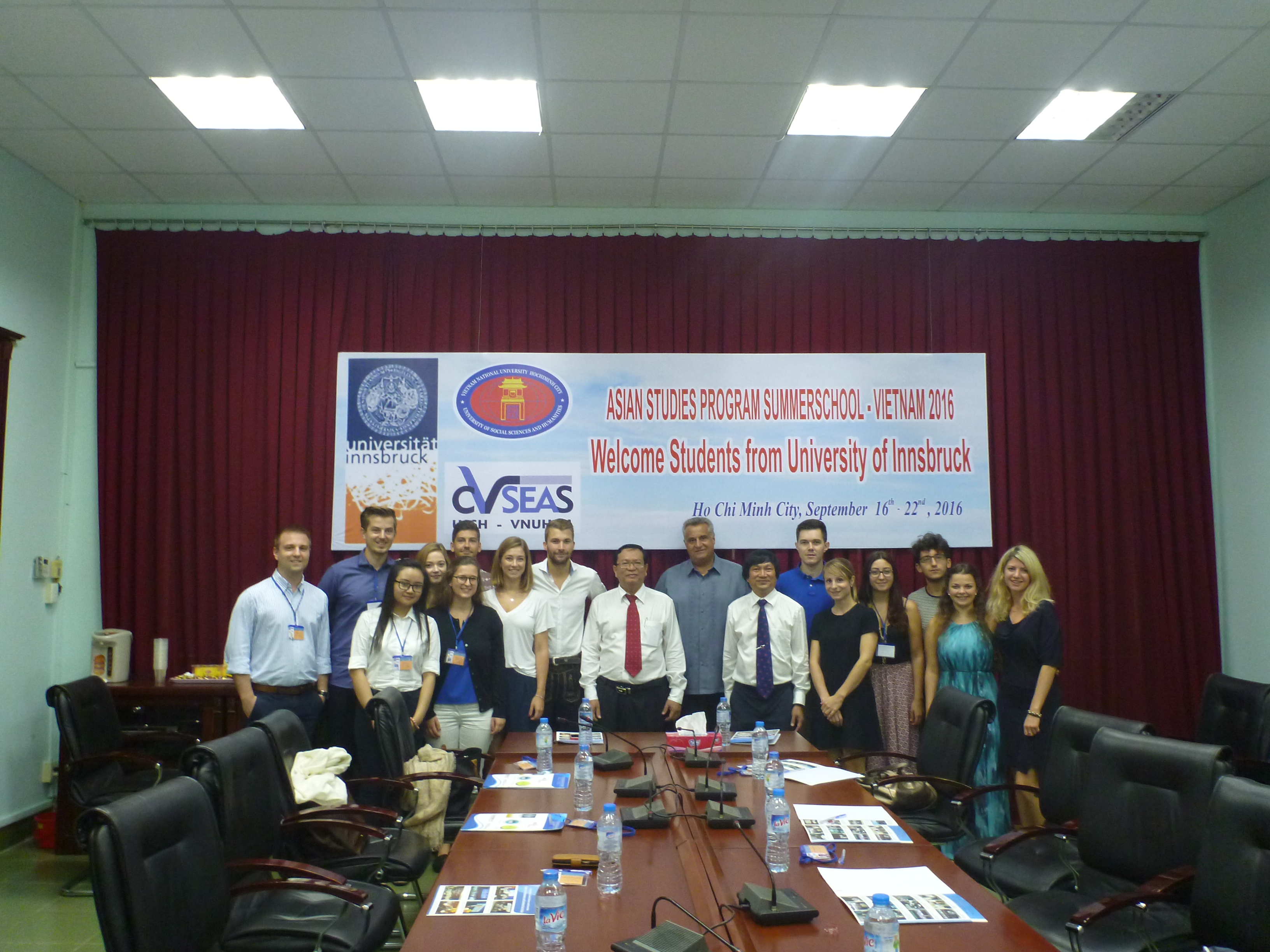 Thứ sáu, 30/09/2016 16:09Từ ngày 16 đến ngày 22/09/2016 vừa qua, Trung tâm Nghiên cứu Việt Nam và Đông Nam Á (TTNC VN-ĐNA) đã đón tiếp Đoàn sinh viên Đại học Innsbruck, Cộng hòa Áo đến tham gia khóa học ngắn hạn mùa hè 2016. Đây là hoạt động hàng năm do TTNC VN-ĐNA phối hợp với Đại học Innsbruck tổ chức.